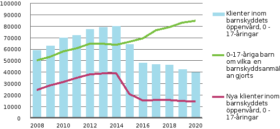 Figur 1 beskriver den förändring som skett i antalet klienter i barnskyddets öppenvård (i åldern 0–17 år), antalet nya klienter i barnskyddets öppenvård (i åldern 0–24 år) och antalet personer som varit föremål för barnskyddsanmälningar (i åldern 0–17 år) under perioden 2008–2020. Antalet barn och unga personer som fått stöd inom barnskyddets öppenvård har minskat under de senaste åren, eftersom en del av dem som tidigare varit klienter i barnskyddets öppenvård numera får tjänster som stöd enligt socialvårdslagen. År 2020 var antalet klienter i barnskyddets öppenvård sammanlagt 48 802 barn och unga personer. Detta är 4 procent av befolkningen i åldern 0–20 år. Antalet minskade med 4 procent från år 2019. Den totala mängden nya klienter inom öppenvården var 30 procent (14 169) år 2020.
