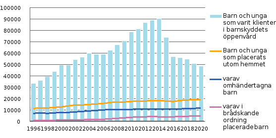 I figur 2 visas förändringar i antalet klientrelationer i barnskyddets öppenvård och i antalet barn och unga personer som varit placerade utanför hemmet under perioden 1996–2020. Antalet placeringar utom hemmet har ökat under denna tid med cirka 7 900 barn och unga personer. År 2020 var sammanlagt 19 086 barn och unga personer placerade utanför hemmet. Av barnen var 11 386 omhändertagna och 4 662 brådskande placerade. Ett barn kan under samma år ingå både i antalet brådskande placeringar och i antalet omhändertagna barn, eftersom ett barn först kan ha placerats brådskande och sedan ha omhändertagits. Av alla placeringar år 2020 var 53 procent pojkar (10 147) och 47 procent flickor (8 955). Andelen pojkar som placerats utanför hemmet har varit större än motsvarande andel för flickor sedan 1990-talet.