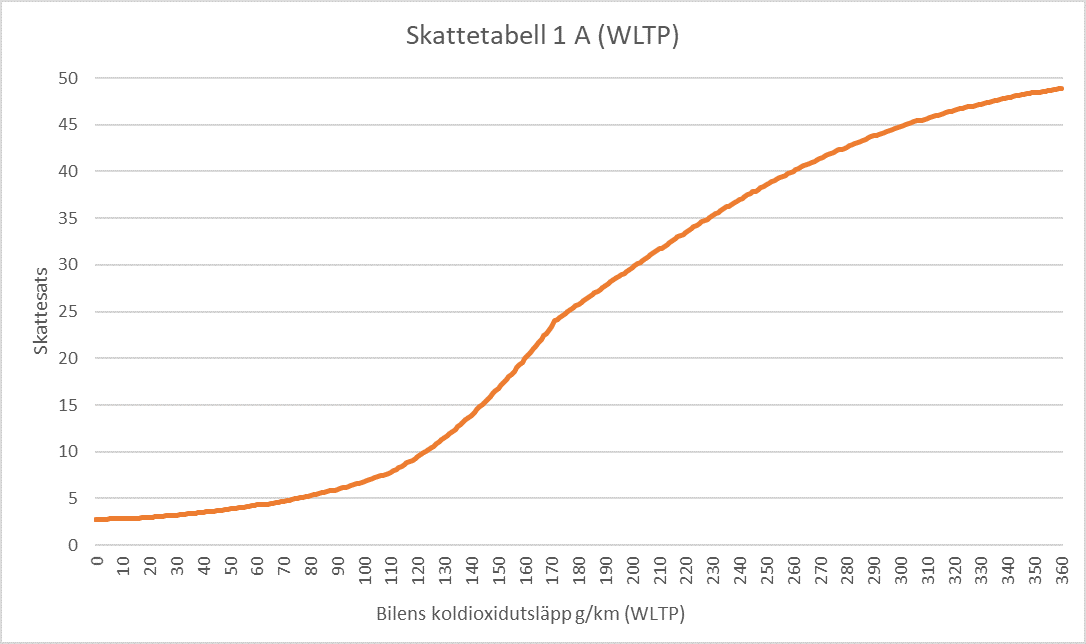 Av figur 1 nedan framgår hur bilskattesatsen bestäms utifrån bilens specifika koldioxidutsläpp enligt skattetabell 1 A. Skattebeloppet stiger per gram mellan de nämnda gränsvärdena.