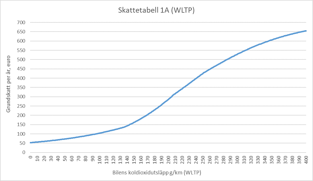 I figur 2 nedan beskrivs hur fordonsskattens grundskatt ändras utifrån bilens koldioxidutsläpp enligt skattetabell 1 A. Skattebeloppet stiger per gram mellan de nämnda gränsvärdena.