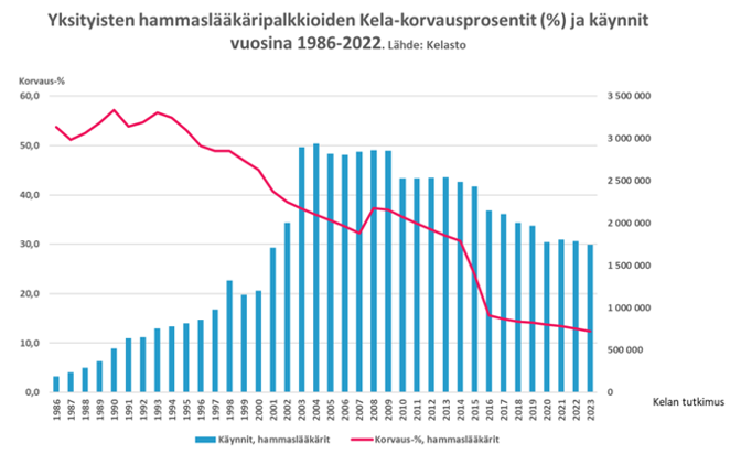 Ersättningsprocent för privattandläkararvoden samt besök 1986–2023. Källa: FPA:s forskning. Texten i bilden lyder på svenska: Yksityisten hammaslääkäripalkkioiden Kela-korvausprosentit (%) ja käynnit vuosina 1986–2022. Lähde: Kelasto = FPA-ersättningsprocent för privattandläkararvoden (%) samt besök 1986–2022. Källa: Kelasto, Korvaus-% = Ersättnings-%, Kelan tutkimus = FPA:s forskning, Käynnit, hammaslääkärit = Besök, tandläkare, Korvaus-%, hammaslääkärit = Ersättnings-%, tandläkare.