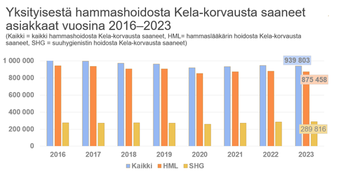 Antalet kunder som fått FPA-ersättning för privat tandvård 2016–2023. Källa: Kelasto. Texten i bilden lyder på svenska: Yksityisestä hammashoidosta Kela-korvausta saaneet asiakkaat vuosina 2016–2023 = Kunder som fått FPA-ersättning för privat tandvård 2016–2023, (Kaikki = kaikki hammashoidosta Kela-korvausta saaneet, HML = hammaslääkärin hoidosta Kela-korvausta saaneet, SHG = suuhygienistin hoidosta Kela-korvausta saaneet) = (Alla = alla som fått FPA-ersättning för tandvård, HML = de som fått FPA-ersättning för tandläkarvård, SHG = de som fått FPA-ersättning för vård som getts av tandhygienist).