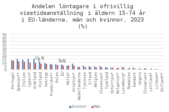 Könsskillnaderna i utbredningen av anställningsförhållanden för viss tid förklaras delvis av att den finländska arbetsmarknaden är indelad i kvinno- och mansdominerade branscher och av de familjeledigheter som till största delen tas ut av kvinnor och skapar ett behov av vikariat. Sutela, H., Viinikka, J. & Pärnänen, A. Työolot murrosten keskellä – Työolotutkimuksen tuloksia 1977–2023, 60–62. Helsingfors: Statistikcentralen. Enligt Statistikcentralens Arbetskraftsundersökning är anställningsförhållandena för viss tid inom den privata sektorn fördelade relativt jämnt mellan män och kvinnor, medan fler kvinnor än män är visstidsanställda inom den offentliga sektorn. Anställningsförhållanden för viss tid är klart vanligare än i snitt även i olika befolkningsgrupper, bland annat bland personer med invandrarbakgrund. Till exempel enligt enkätundersökningen från år 2022 av EU:s byrå för grundläggande rättigheter är andelen anställningsförhållanden för löntagare av afrikansk bakgrund över två gånger större än bland hela befolkningen.