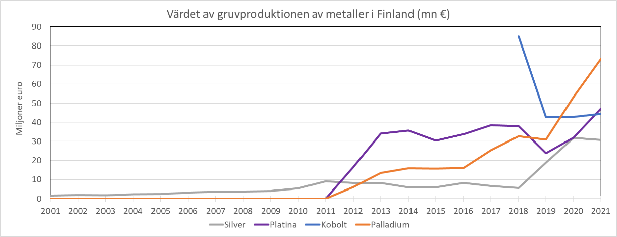 Bilagan. I bilagan till lagen finns det en uttömmande bestämmelse om de metallmalmer som beskattas enligt värde. Även om de gruvmineral som nämns i bilagan är grundämnen som framställs av gruvmineral och inte alltid gruvmineral, benämns de gruvmineral. I bilagan ingår sådana metallmalmer som bryts ur finländsk mark. Metallmalmerna är guld, kobolt, koppar, krom, litium, nickel, palladium, platina, silver och zink. Metallernas kemiska tecken anges inom parentes.