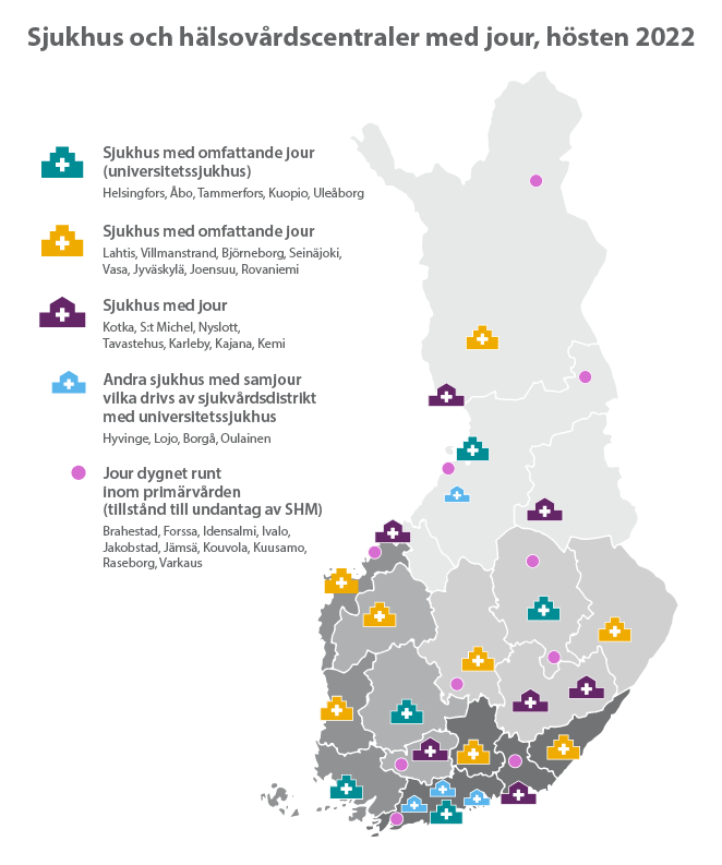 Figur 1. Placeringen av de sjukhus och hälsovårdscentraler i Finland som har jour dygnet runt. Situationen hösten 2022.