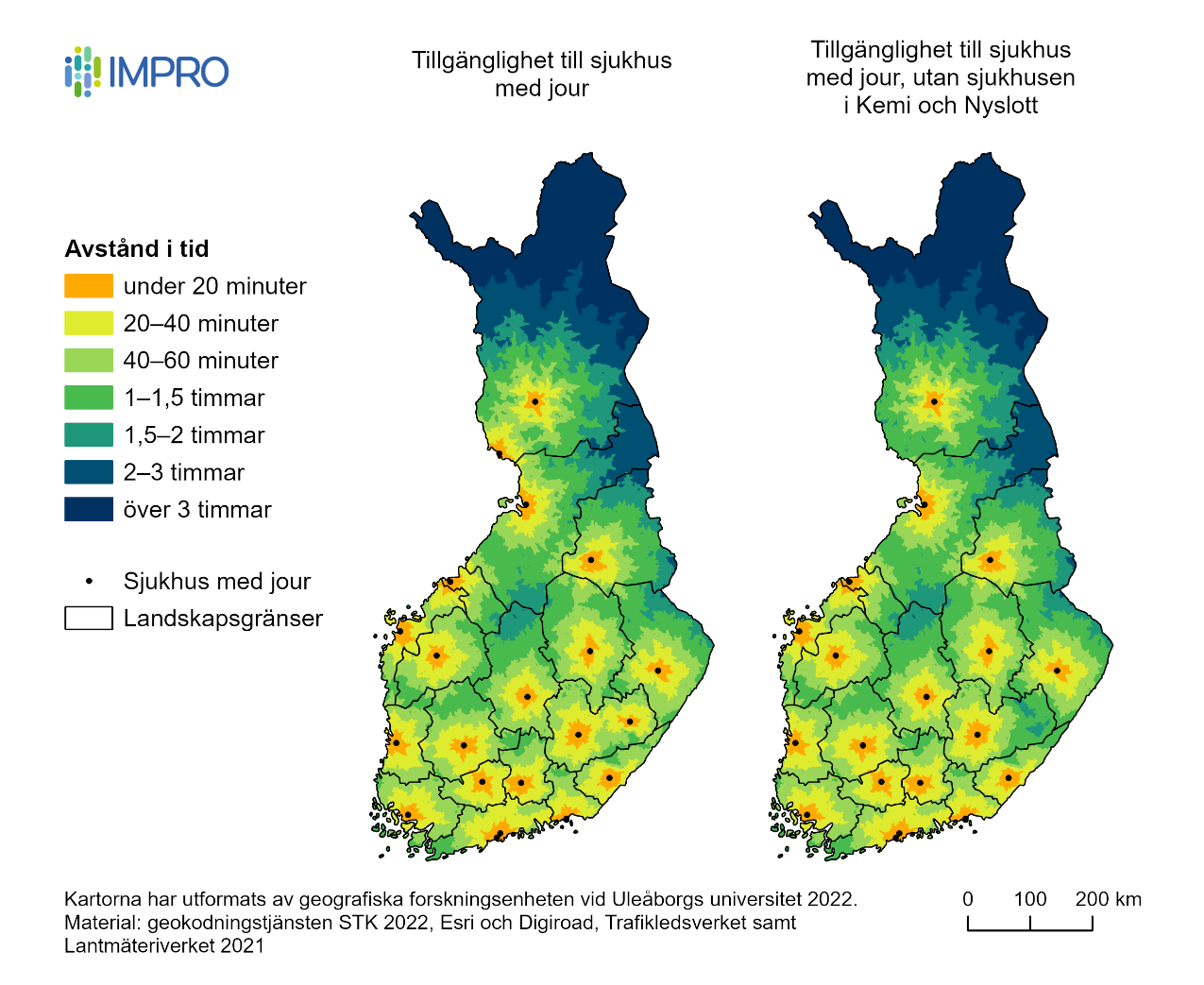 I figur 2 beskrivs restiden och tillgängligheten till sjukhus med samjour enligt den gällande hälso- och sjukvårdslagen. Upprätthållandet av samjouren vid sjukhusen i Kemi och Nyslott ökar tillgängligheten. Om det inte finns samjour vid de sjukhusen förlängs restiden till en enhet med samjour från dessa regioner men kommer ändå att vara mindre än två timmar även för deras del. Sträckan från Kemi till Uleåborg via landsväg är cirka 107 km och till Rovaniemi cirka 118 km. Från Nyslott till S:t Michel är sträckan via landsväg cirka 105 km och till Kuopio cirka 160 km. Det behöver beaktas att man utöver att upprätthålla samjour också kan göra jourhavande läkare tillgängliga dygnet runt med hjälp av jour inom primärvården eller akutmedicinen i enlighet med 50 § 5 mom. i hälso- och sjukvårdslagen, vilket är ett lättare alternativ med tanke på de krav som ställs på organiseringen och med tanke på finansieringen. Detta alternativ behandlas närmare i avsnitt 5 Alternativa handlingsvägar.