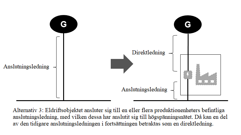 Enligt 4 § 2 punkten i elmarknadslagen är eldistribution genom en direktledning inte tillståndspliktig elnätsverksamhet, om den el som distribueras har producerats vid småskalig elproduktion. På en direktledning tillämpas inte heller elmarknadslagens allmänna skyldigheter som gäller distributionsnätsinnehavare. En direktledning får dock inte bilda en slinga till elnätet eller mellan elnät och två eller flera eldriftsobjekt som är anslutna till distributionsnätet kan inte kombineras med varandra.