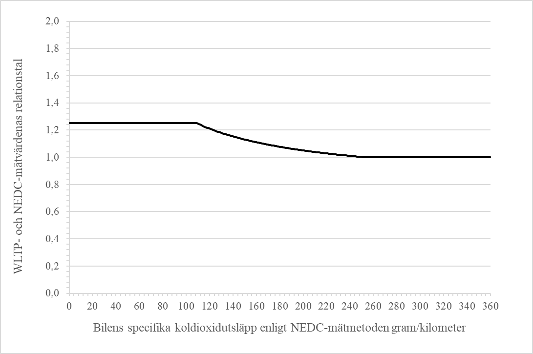 Med stöd av JRC:s undersökning är det också möjligt att beakta variationen i effekterna av ändringen av mätmetoden på olika utsläppsnivåer, varvid resultatet är en så neutral lösning som möjligt som kan jämföras med nuläget. Skillnaden på olika utsläppsnivåer mellan WLTP- och NEDC-mätmetoderna har i undersökningen specificerats för bilar med förbränningsmotor och dessutom har det gjorts en uppskattning av skillnaden mellan mätmetoderna när det gäller olika el- och gasdrivna bilar. I figur 1 beskrivs det förhållande mellan utsläppsvärdena enligt WLTP- och NEDC-mätmetoderna som vid anpassningen av skattetabellerna använts på olika utsläppsnivåer enligt NEDC-mätmetoderna. I intervallen 110—250 gram koldioxid per kilometer baserar sig relationstalet på JRC:s undersökning. Figuren visar till exempel att på utsläppsnivån 120 gram koldioxid per kilometer enligt NEDC-mätmetoden är utsläppsvärdet enligt WLTP-mätmetoden cirka 1,2 gånger högre, det vill säga cirka 144 gram koldioxid per kilometer. Relationstalet minskar när utsläppsnivån stiger så att utsläppsnivån 250 gram koldioxid per kilometer i enlighet med NEDC-mätmetoden är lika stor också i enlighet med WLTP-mätmetoden.