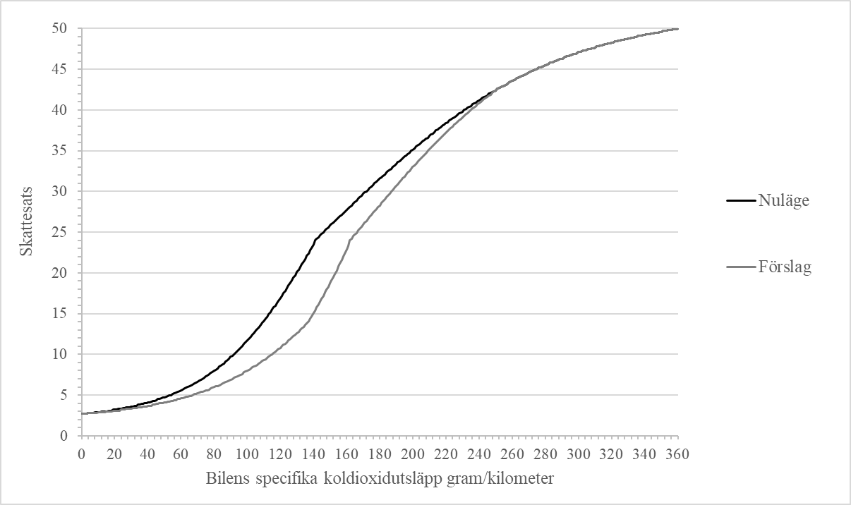 I figur 2 beskrivs den föreslagna ändringen av bilskattekurvan 2018 och i figur 3 beskrivs ändringen av bilskattekurvan 2019.