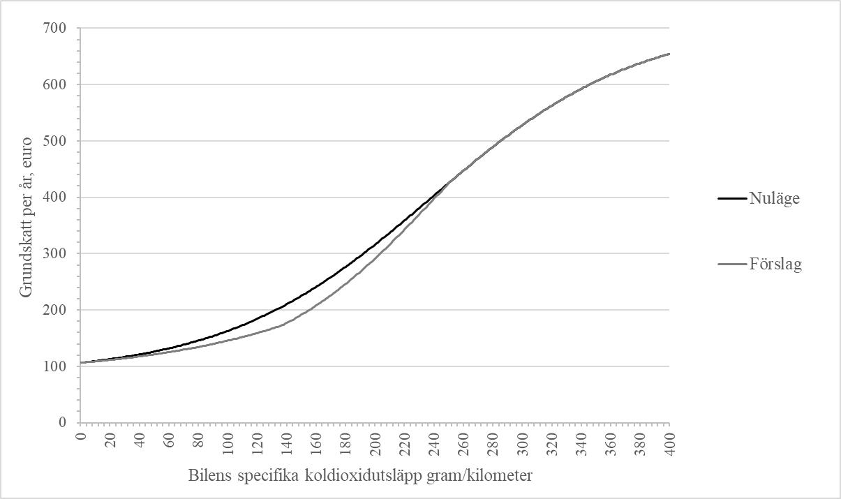 I figur 4 redogörs det för den föreslagna ändringen av skattekurvan för fordonsskattens grundskatt.