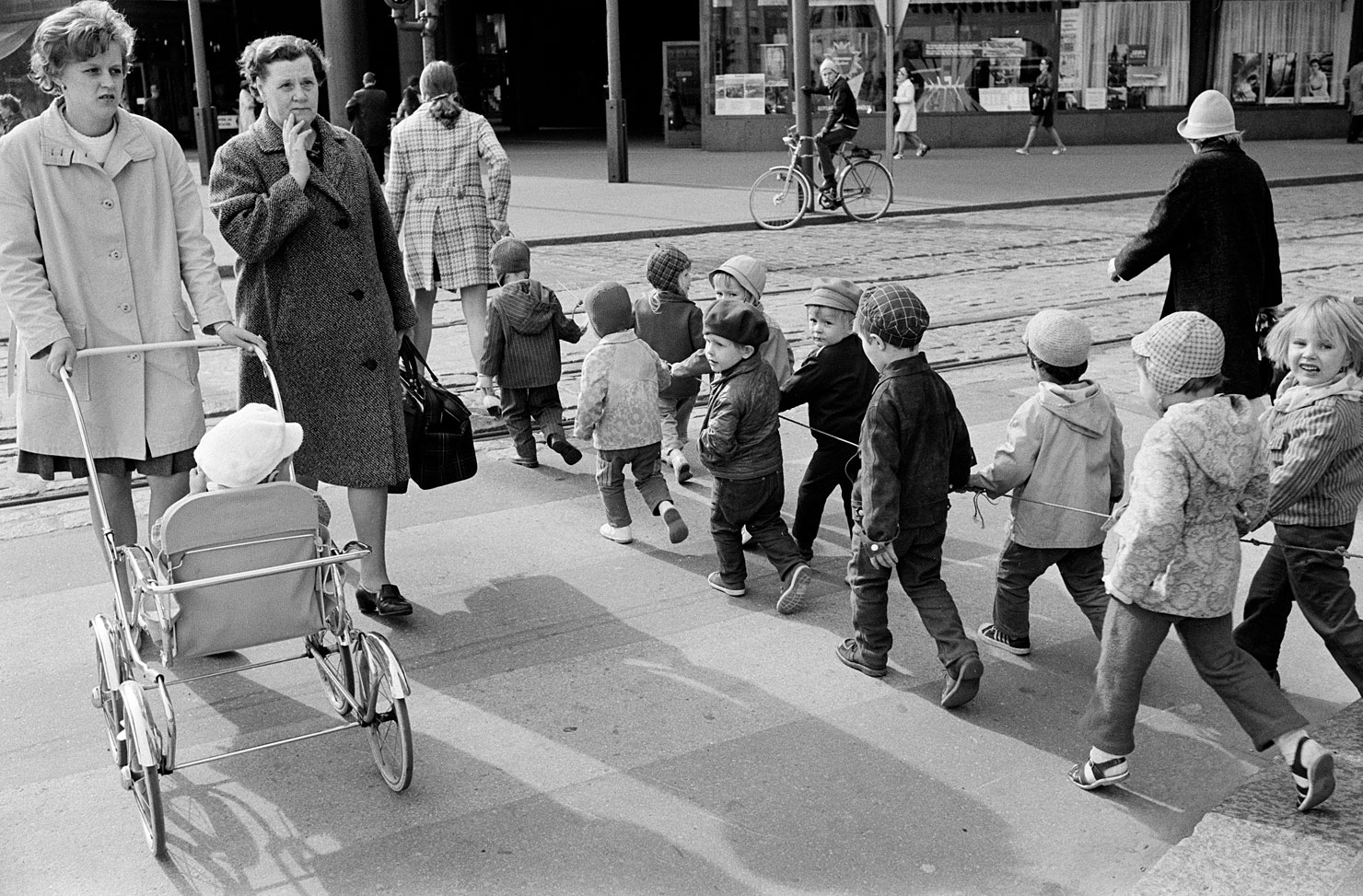 Genom lagstiftningen utvidgades de sociala skyddsnäten framför allt på 1960- och 1970-talen. Rätten till dagvård kom 1973. På bilden daghemsbarn på väg till Tokoistrandens park i Helsingfors 1970.